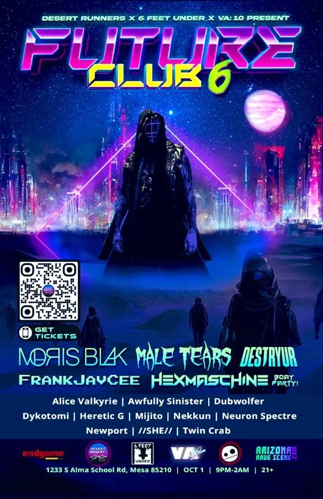 The 6th edition of Future Club is upon us, with it being Hexmaschine's big birthday bash! Moris Blak, Male Tears, Destryur, Daemon Chadeau, and FrankJavCee are all coming to town for this one! 17 acts across 3 stages full of cyberpunk, goth, vaporwave, synthpop, synthwave and others!!